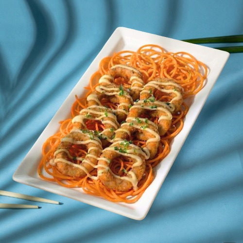 8 camarones crunch, salsa fantasy, cebollín y una cama de zanahoria en espiral.