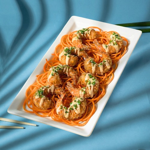 8 camarones crunch, salsa fantasy, cebollín y una cama de zanahoria en espiral.