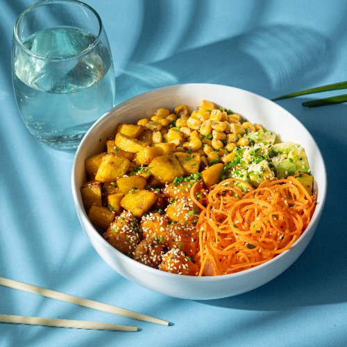 Poke con arroz de sushi, zanahoria, aguacate, pollo tempura bañado en salsa agrudulce, platano maduro, maíz tostado, cebollín y ajonjolí