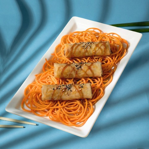 3 spring roll, salsa teriyaki, ajonjolí mixto y una cama de zanahoria en espiral.