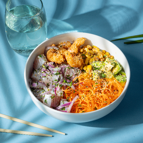 Poke Arroz de sushi, tilapia tempura, aguacate, cebolla morada, monedas de plátano verde, maíz tostado, salsa acevichada, zanahoria y cebollín.