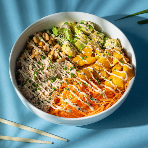 Poke con arroz de sushi, aguacate, zanahoria, maíz dulce, pepino, mango, cebolla crispy, salsa, cebollin y ajonjolí.