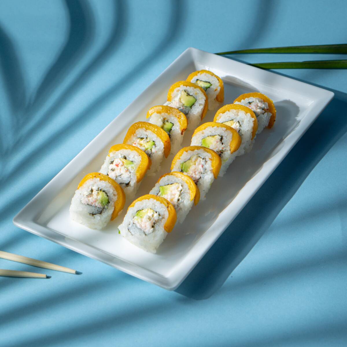 Arroz de sushi, palmito de cangrejo tempura, maíz tostado, aguacate, plátano maduro, mango, zanahoria, salsa, ajonjolí, cebollín y bebida a elección.