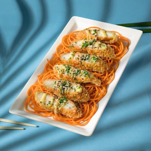 6 palmitos crunch, salsa fantasy, cebollín y una cama de zanahoria en espiral.