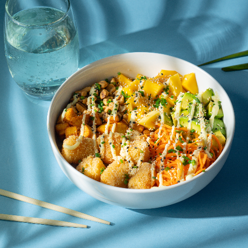 Poke con arroz de sushi, aguacate, zanahoria, maíz dulce, pepino, mango, cebolla crispy, salsa, cebollin y ajonjolí.