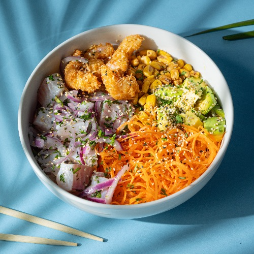 Poke Arroz de sushi, tilapia tempura, aguacate, cebolla morada, monedas de plátano verde, maíz tostado, salsa acevichada, zanahoria y cebollín.