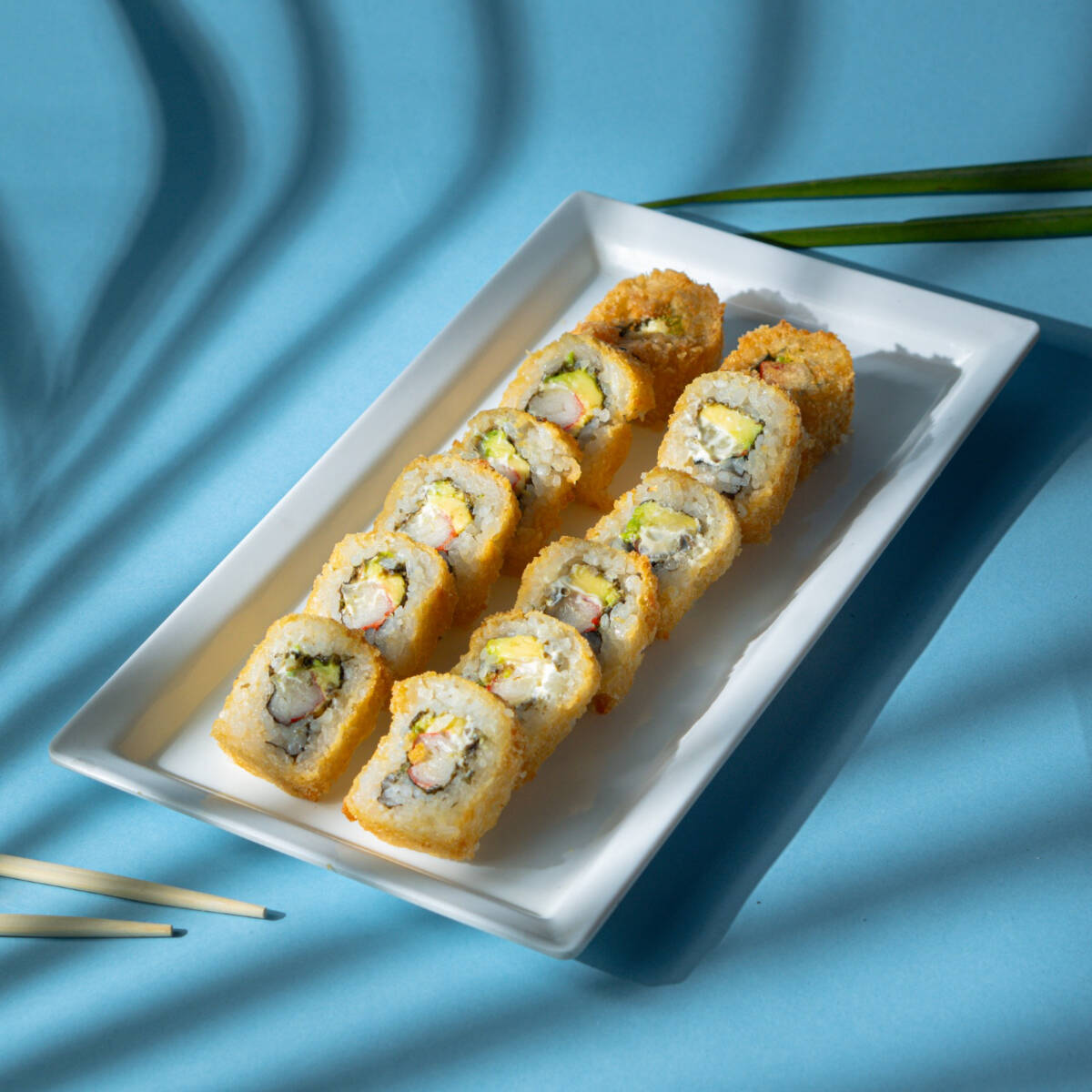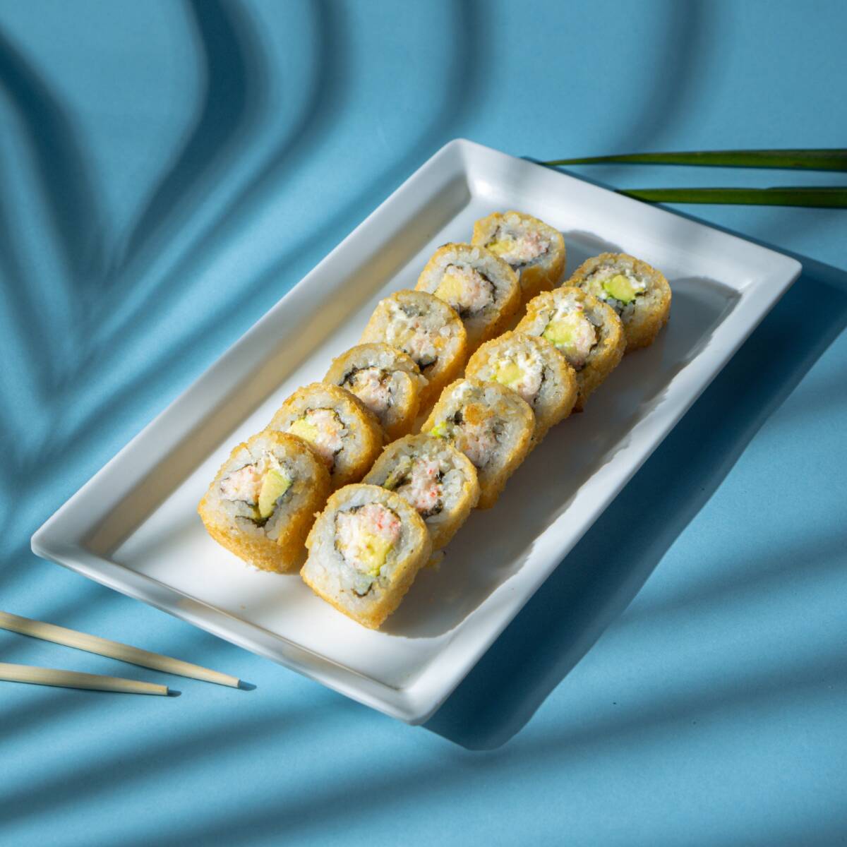 Sushi relleno de palmito de cangrejo, queso crema y aguacate, todo tempura, 12 piezas.