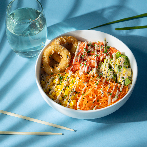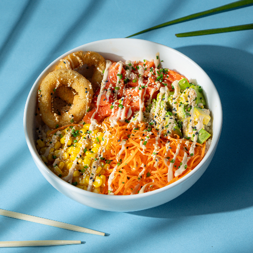 Poke de Arroz de sushi, salmón fresco, aguacate, maíz tierno, aros de cebolla, zanahoria, ajonjolí, cebollín y salsa.