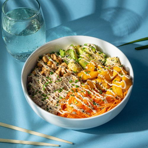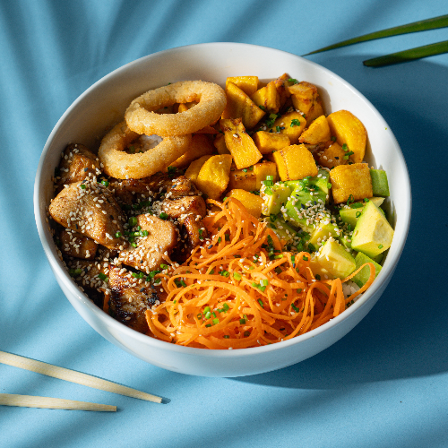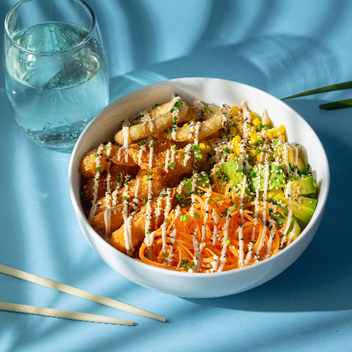 Poke con arroz de sushi, zanahoria, aguacate, pollo tempura bañado en salsa agrudulce, platano maduro, maíz tostado, cebollín y ajonjolí
