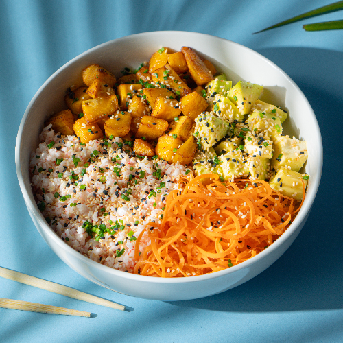 Poke con arroz de sushi, aguacate, zanahoria, maíz dulce, pepino, mango, cebolla crispy, salsa, cebollin y ajonjolí.