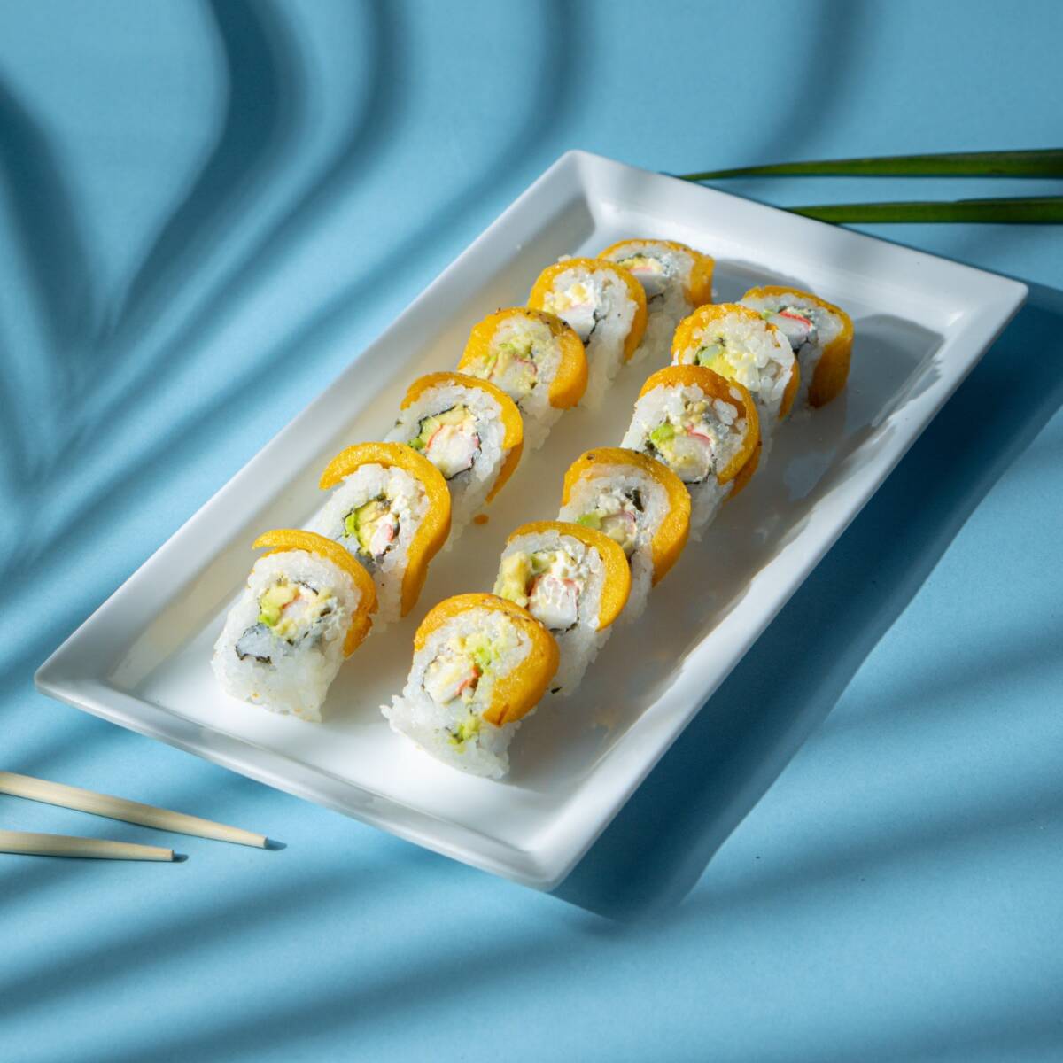 Arroz de sushi, palmito de cangrejo tempura, maíz tostado, aguacate, plátano maduro, mango, zanahoria, salsa, ajonjolí, cebollín y bebida a elección.