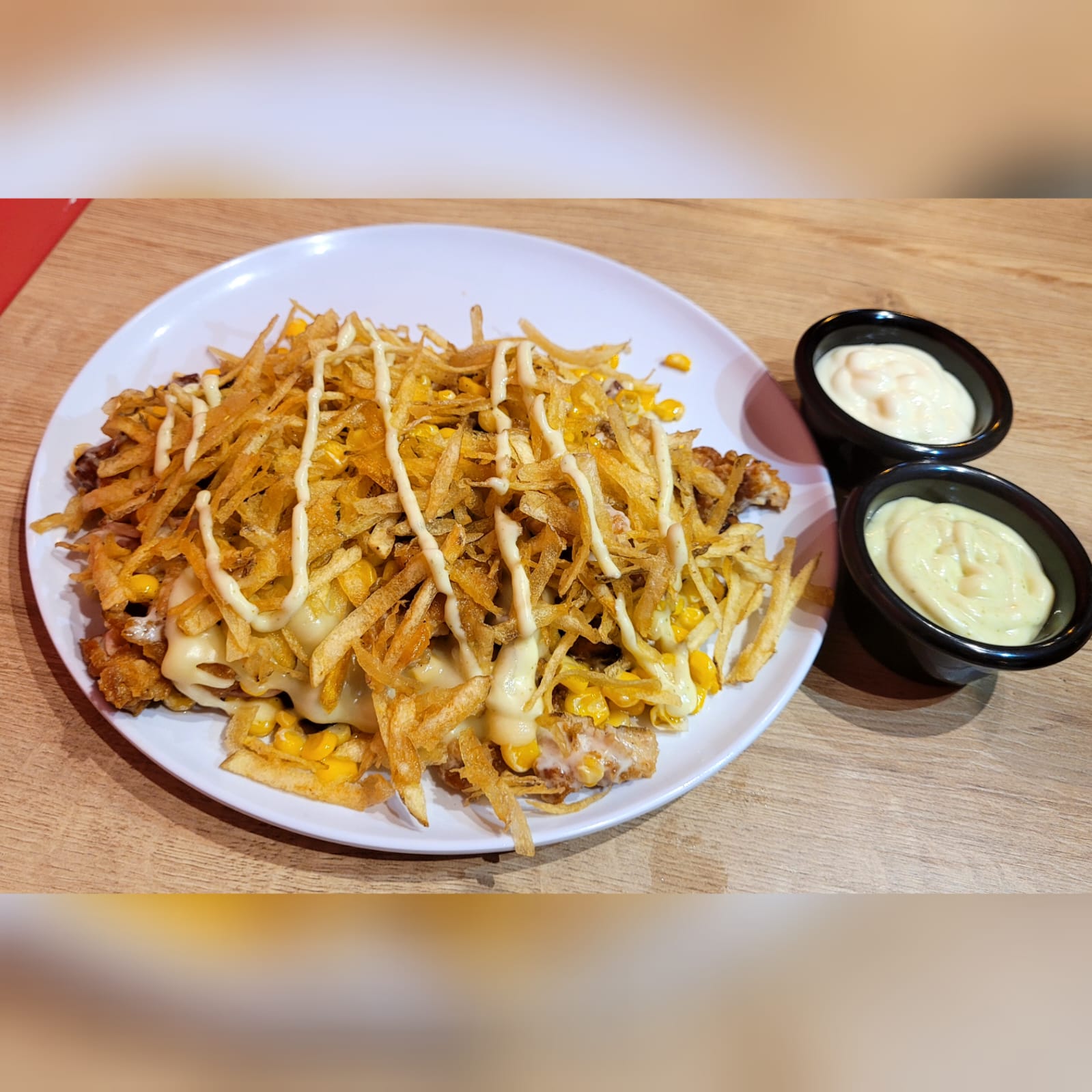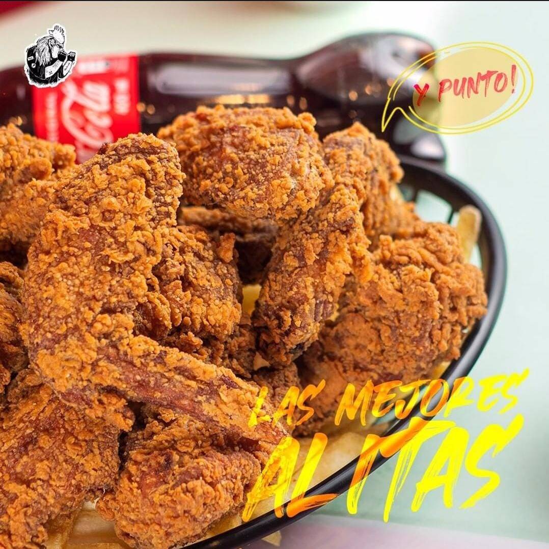 Muslo de pollo frito, Maíz, Tocineta ahumada, Trozitos de maduro, Chorizo, Papa ripio artesanal, Salsa de cilantro y Salsa de ajos.