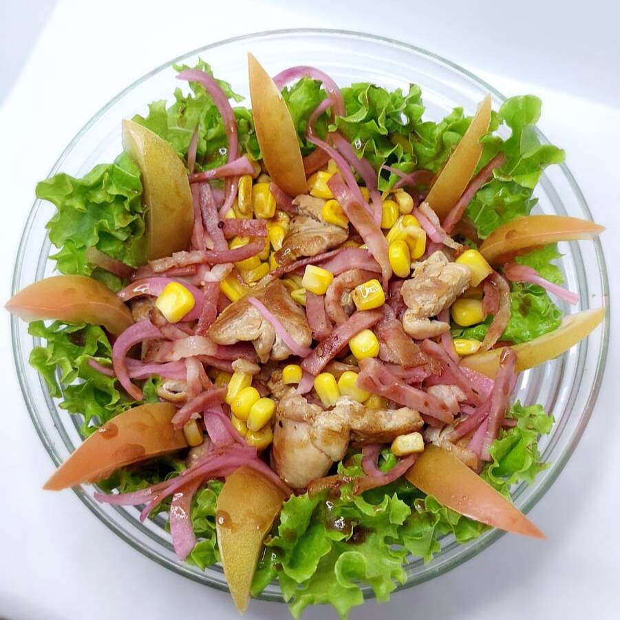 Trositos de muslo a la plancha, maiz desgranado, cebollas encurtidas, tocineta ahumada, tomate fresco, lechuga y vinagreta balsamica