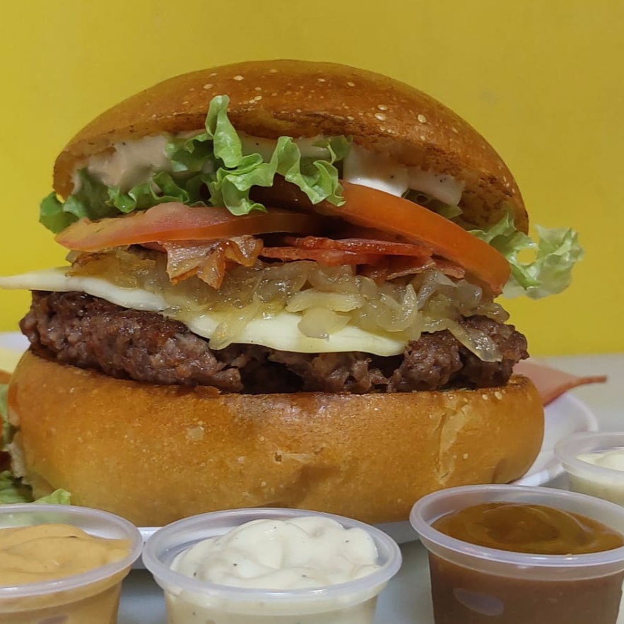 130 gramos de carne de res, Tocineta ahumada, queso mozarella, Cebollas caramelizadas, lechuga, Tomate, Mayonesa de cilantro y pan Artesanal