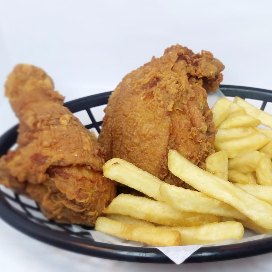 2 Presas de pollo apanadas acompañadas de papa a la francesa