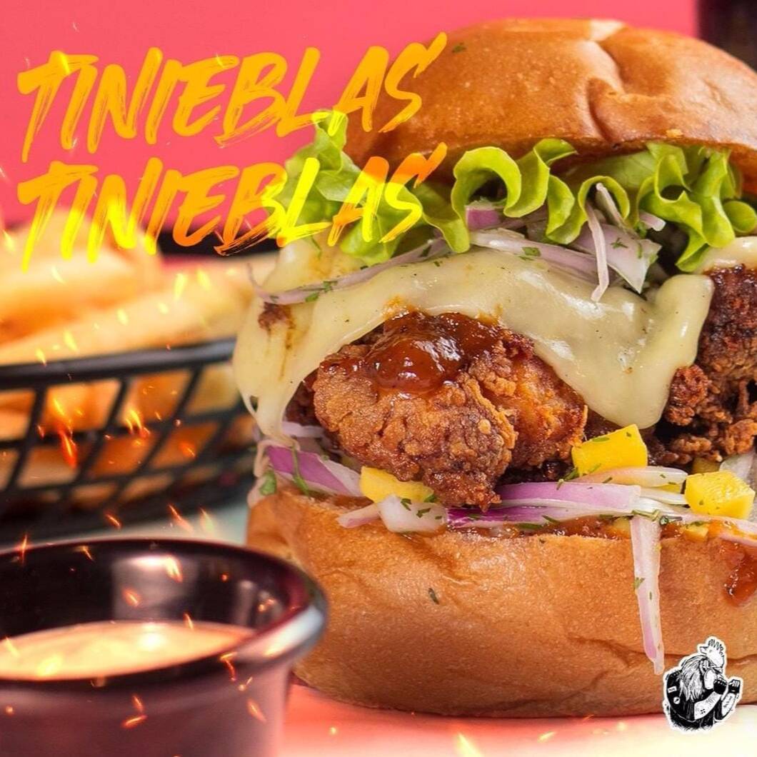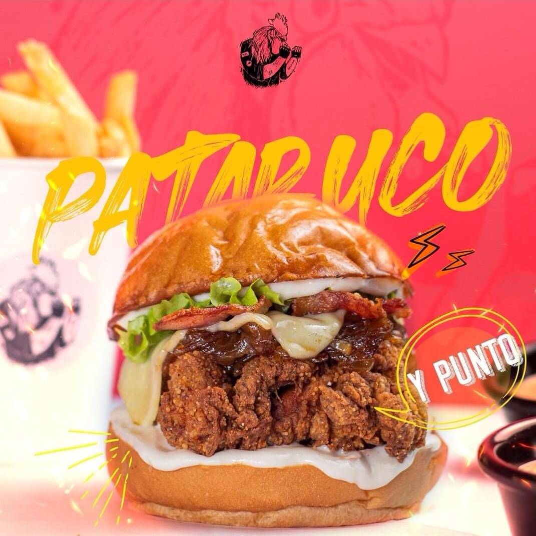 Hamburguesa Pataruco (Pan de huevo, pollo frito, tocineta ahumada, queso mozzarella, cebollas caramelizadas, lechuga y mayonesa de ajos asados) + Hamburguesa Tinieblas: (Pan de huevo, pollo frito, pico de gallo de mango, salsa de mango y chile, queso mozzarella y lechuga) + Papas a la Francesa + 2 Gaseosa 500 ml
