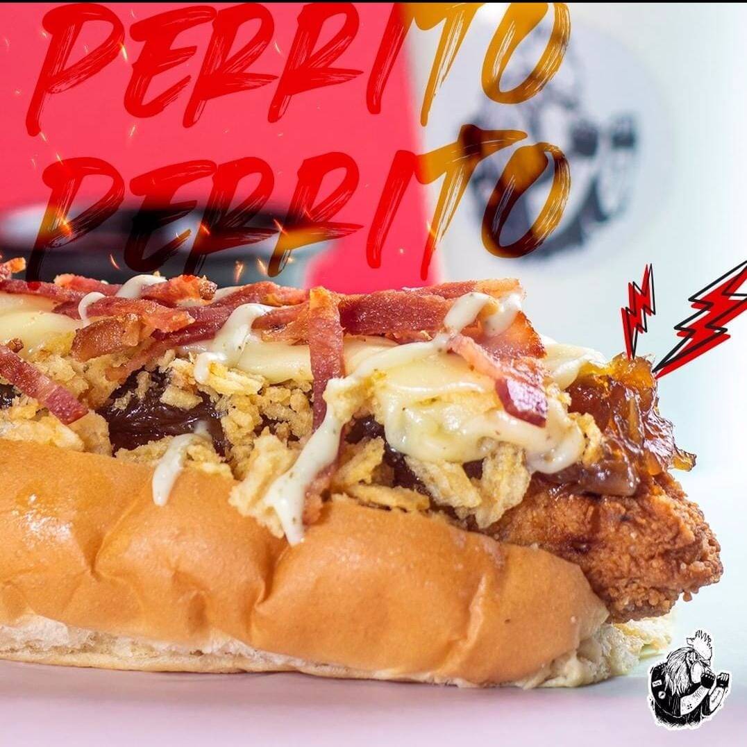 pan de huevo, salchicha de pollo de la casa, queso mozzarella, tocineta, cebollas caramelizadas, mayonesa de cilantro, ripio de papa.