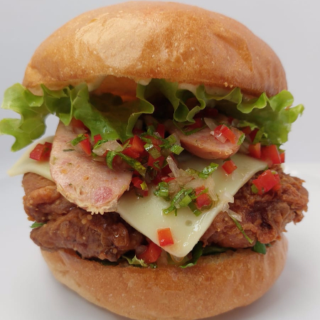 Pan Artesanal, pollo frito, tocineta ahumada, queso mozzarella, cebollas caramelizadas, lechuga y mayonesa de ajos asados.