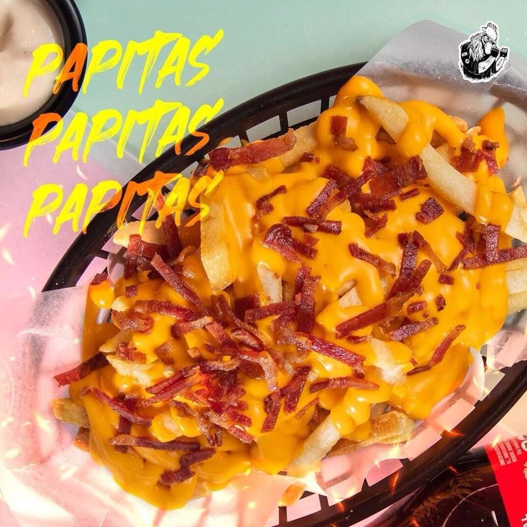 Papas a la francesa, queso cheddar liquido y tocineta.