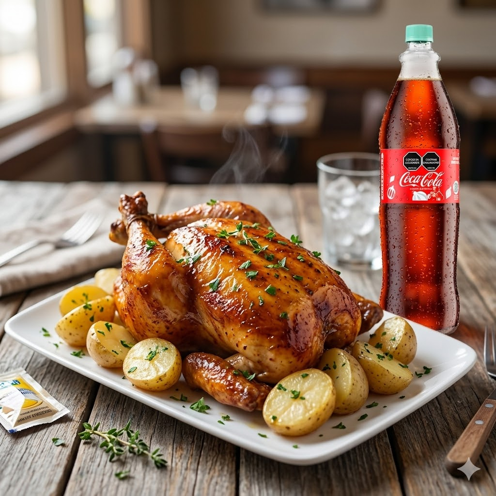 1 pollo y medio asado acompañado de papa salada, arepa, plátano maduro + Gaseosa Postobón 1lt