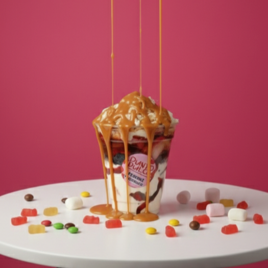Deliciosa base de merengue con crema artesanal, mas 4 Topping entre fruta y dulce , mas Dos salsas ,combinalos como quieras
