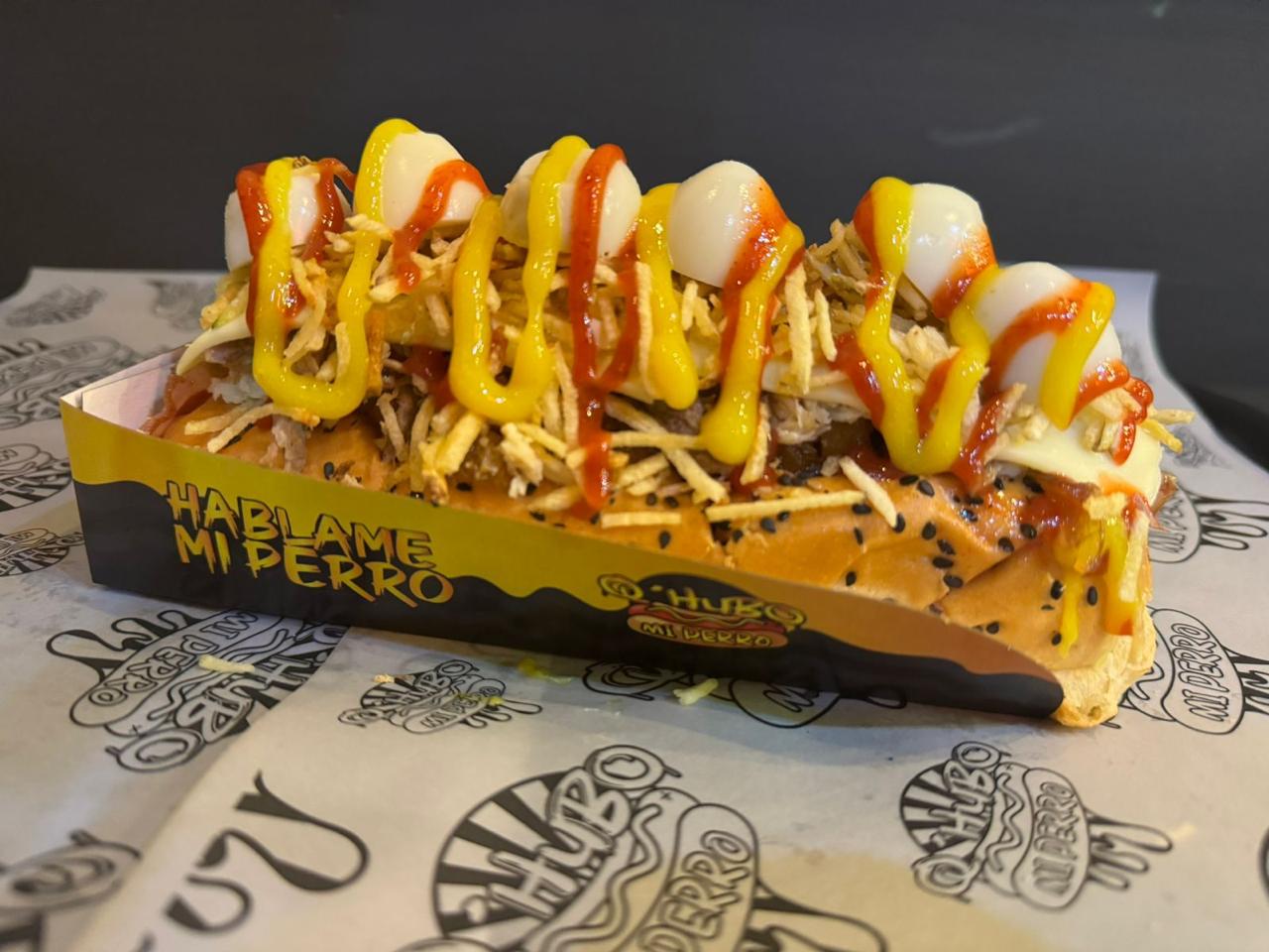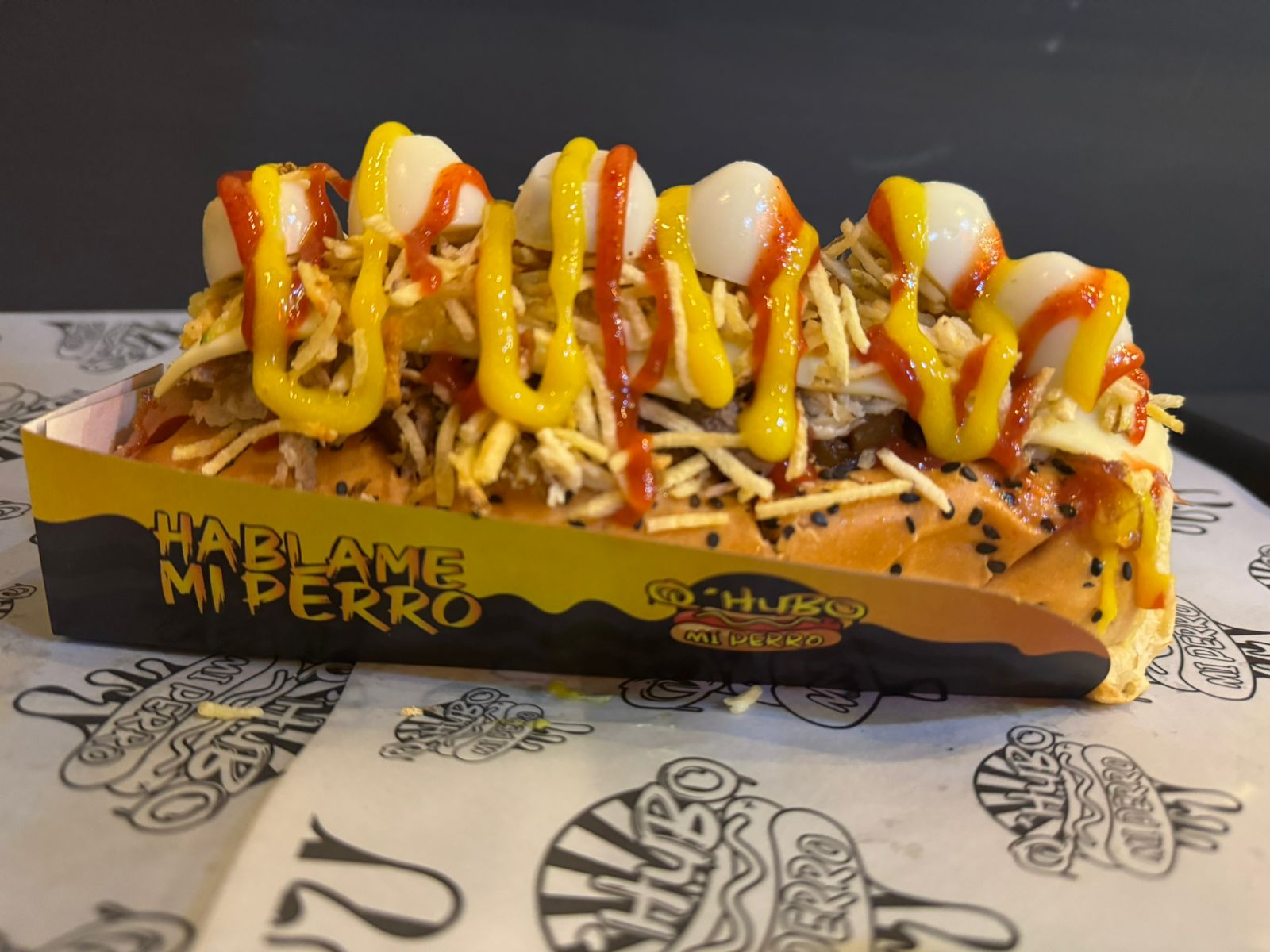 Perro caliente con pan de la casa, salchicha americana, papas fosforito, cebolla caramelizada, queso, jamón, 6 huevos de codorniz, pollo desmechado, maduro y salsas de la casa.