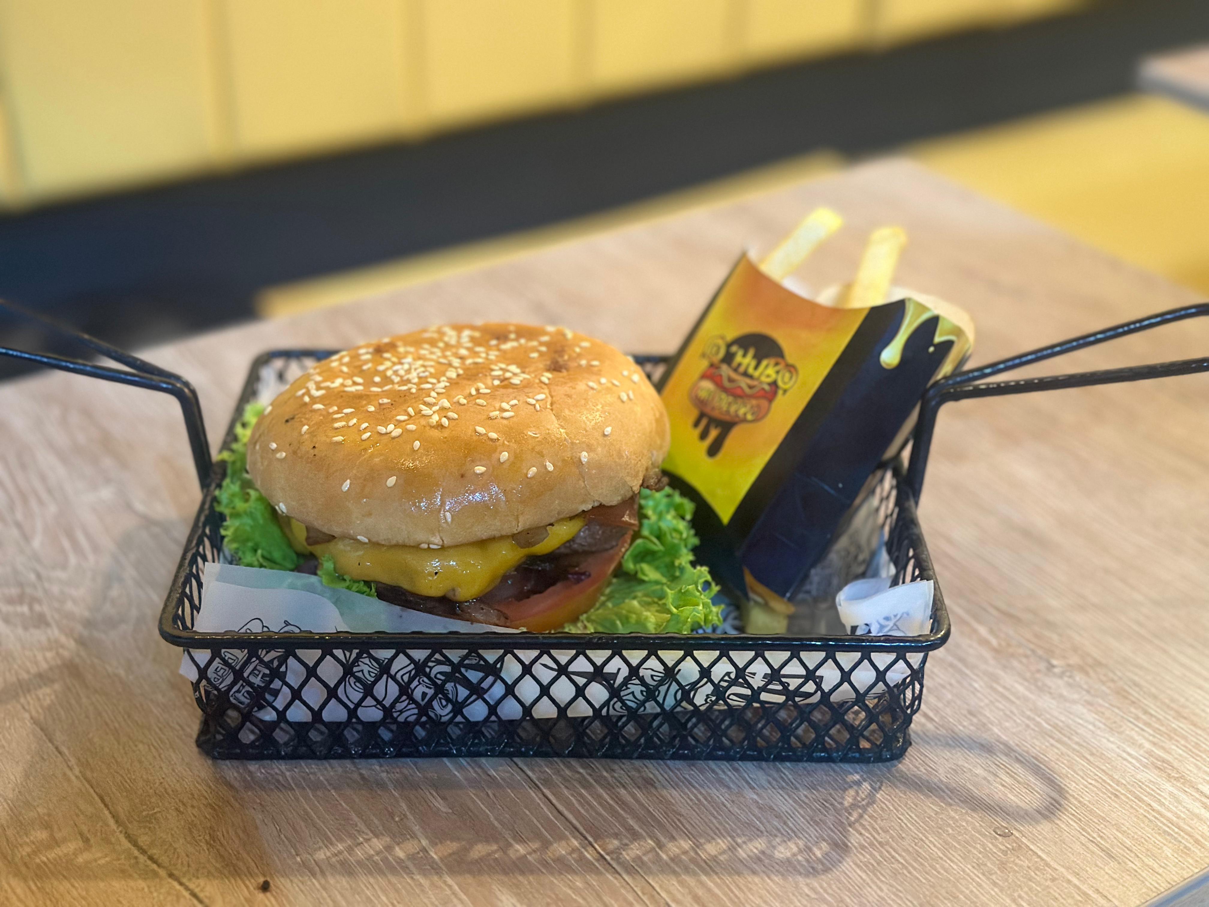 Pan de la casa 150 g de carne blend, queso cheddar, tocineta caramelizada, lechuga, tomate y salsas (tomate, mayonesa, mostaza) con porción de papas a la francesa y gaseosa 250 ml Coca Cola.