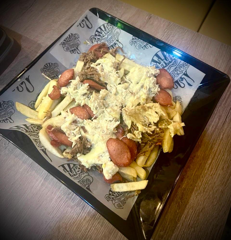 PAPA FRANCESA, SALCHICHA AMERICANA, POLLO Y CARNE DESMECHADA QUESO GRANTIN Y SALSAS DE LA CASA