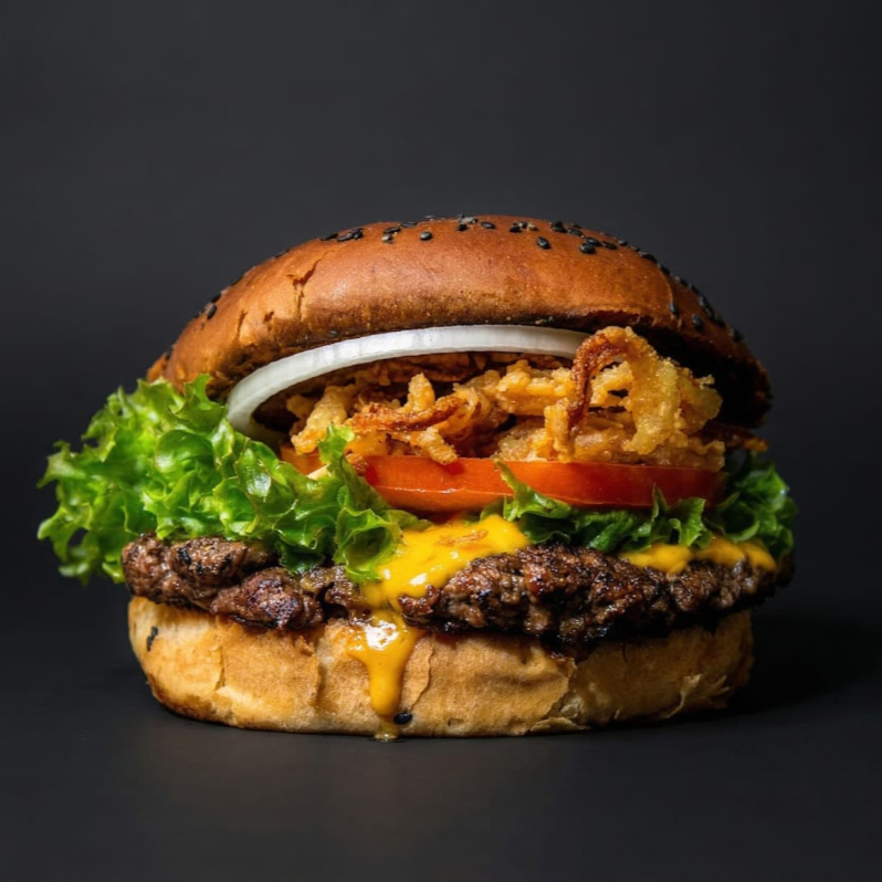 130 gr carne tipo smash gratinado con queso cheddar, pan de la casa, tomate tatemado, lechuga romana y cebollitas locas crocantes