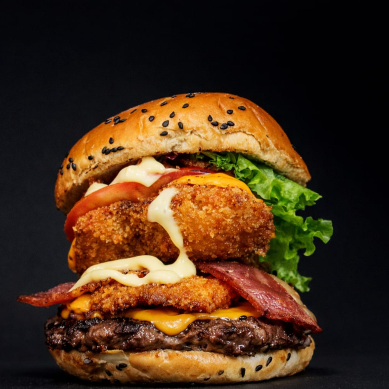 CARNE DE 130 GR POLLO CROCANTE, TOCINETA, QUESO CHEDDDAR, LECHUGA ROMANA, TOMATE TATEMADO Y SALSAS DE LA CASA