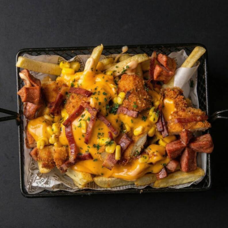 PAPA FRANCESA, SALCHICHA AMERICANA, CHICKEN TENDERS TOCINETA CRISPY, QUESO CHEDDAR, PAPA FOSFORO Y MAIZ SEMI DULCE