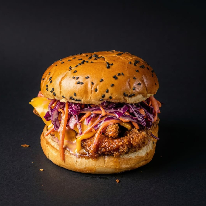 120 gr de pollo crispy crocante, con ensalada coleslaw, gratinado con queso cheddar, pan de la casa y salsa especial