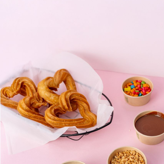 5 Churros en forma de corazon 1 salsa y 1 toping.