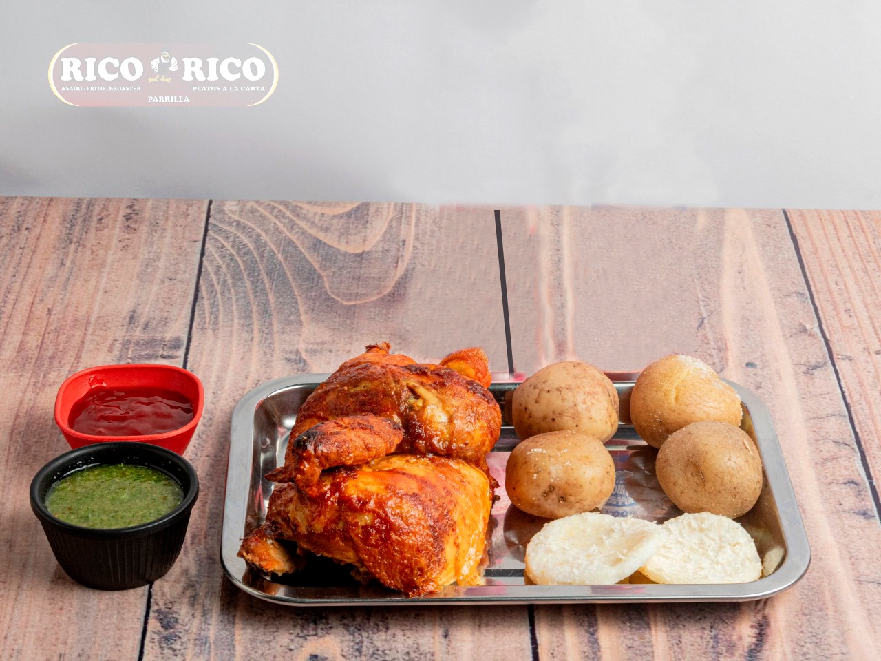1 pollo asado, Carne de res, Carne de cerdo, Chorizo, Pechuga, Papa salada, Papa francesa, Yuca, Patacón