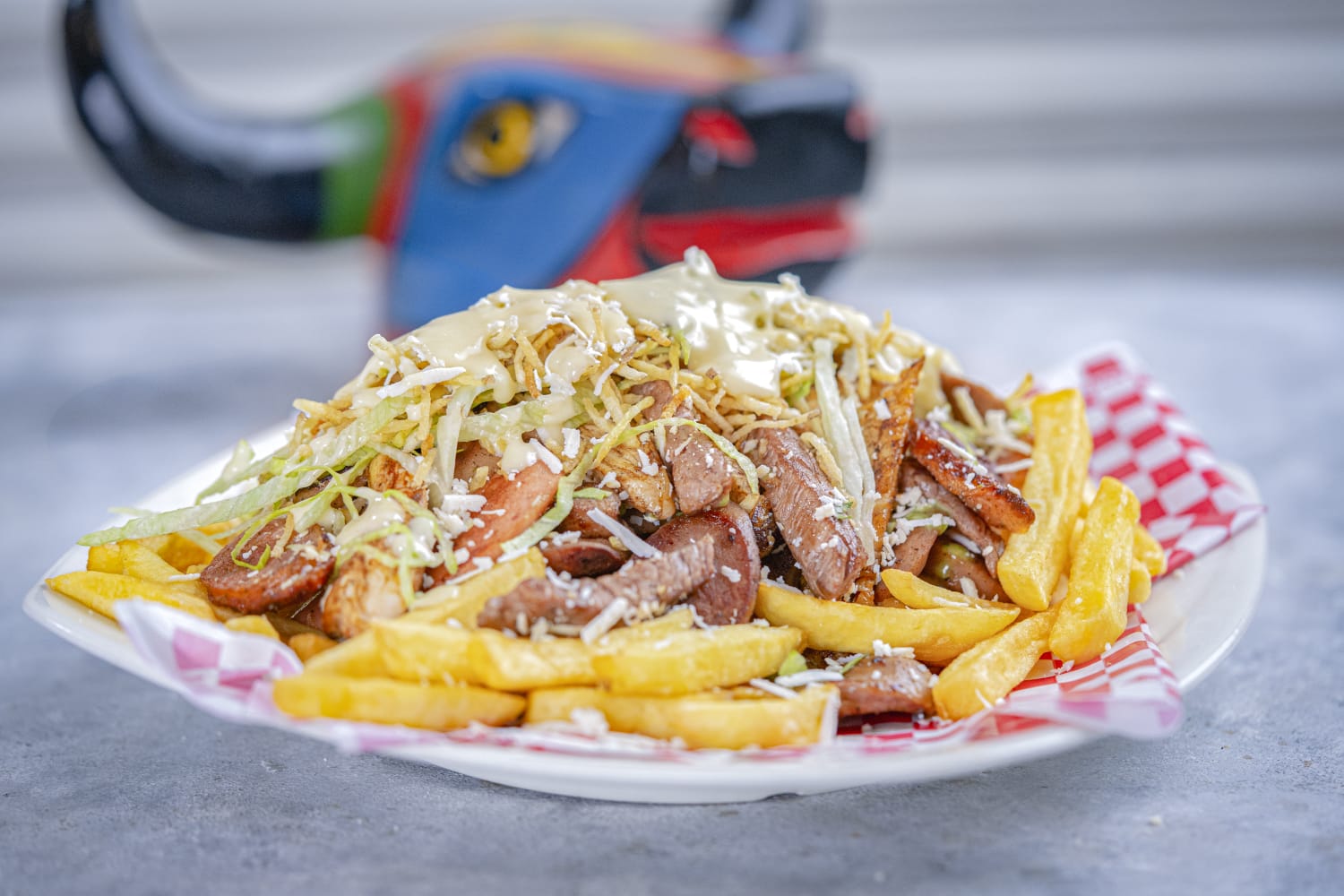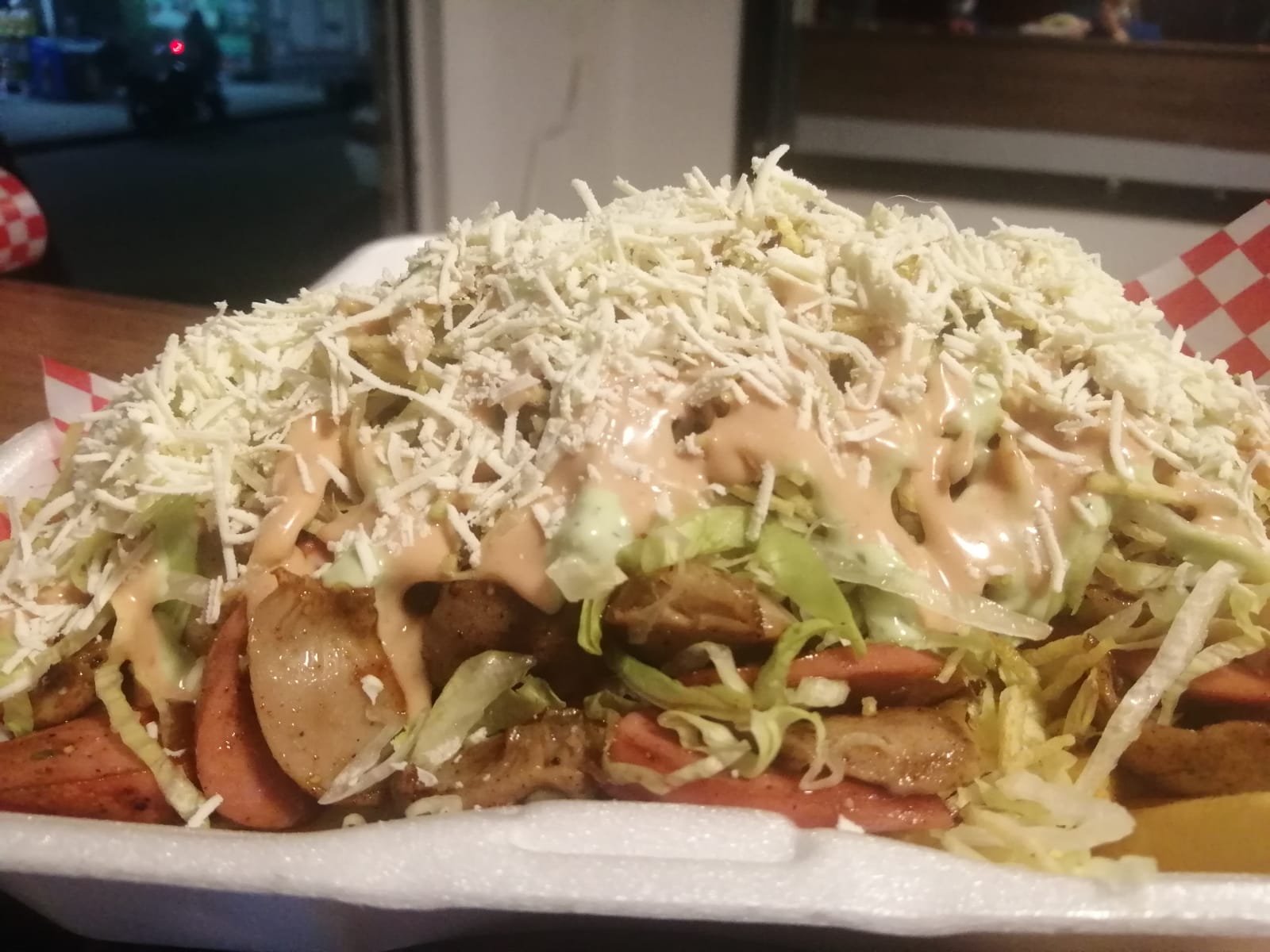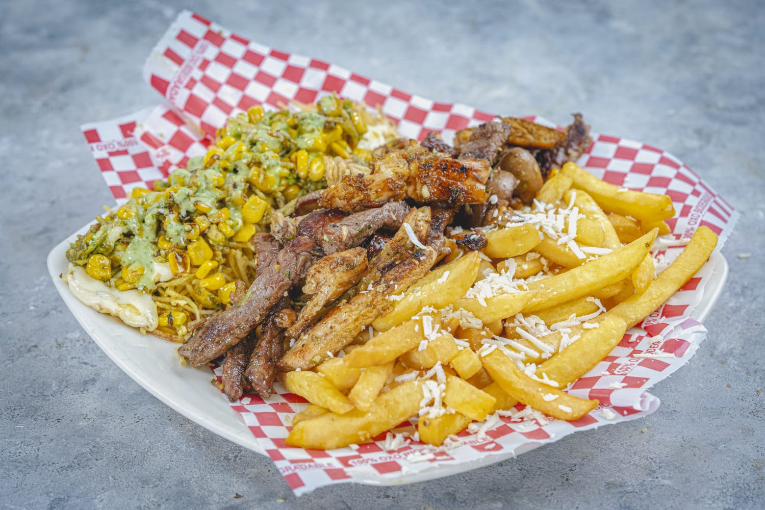 Ideal para dos personas | Papa francesa,pollo,carne,butifarra,salchicha long, lechuga,queso costeño, salsas.