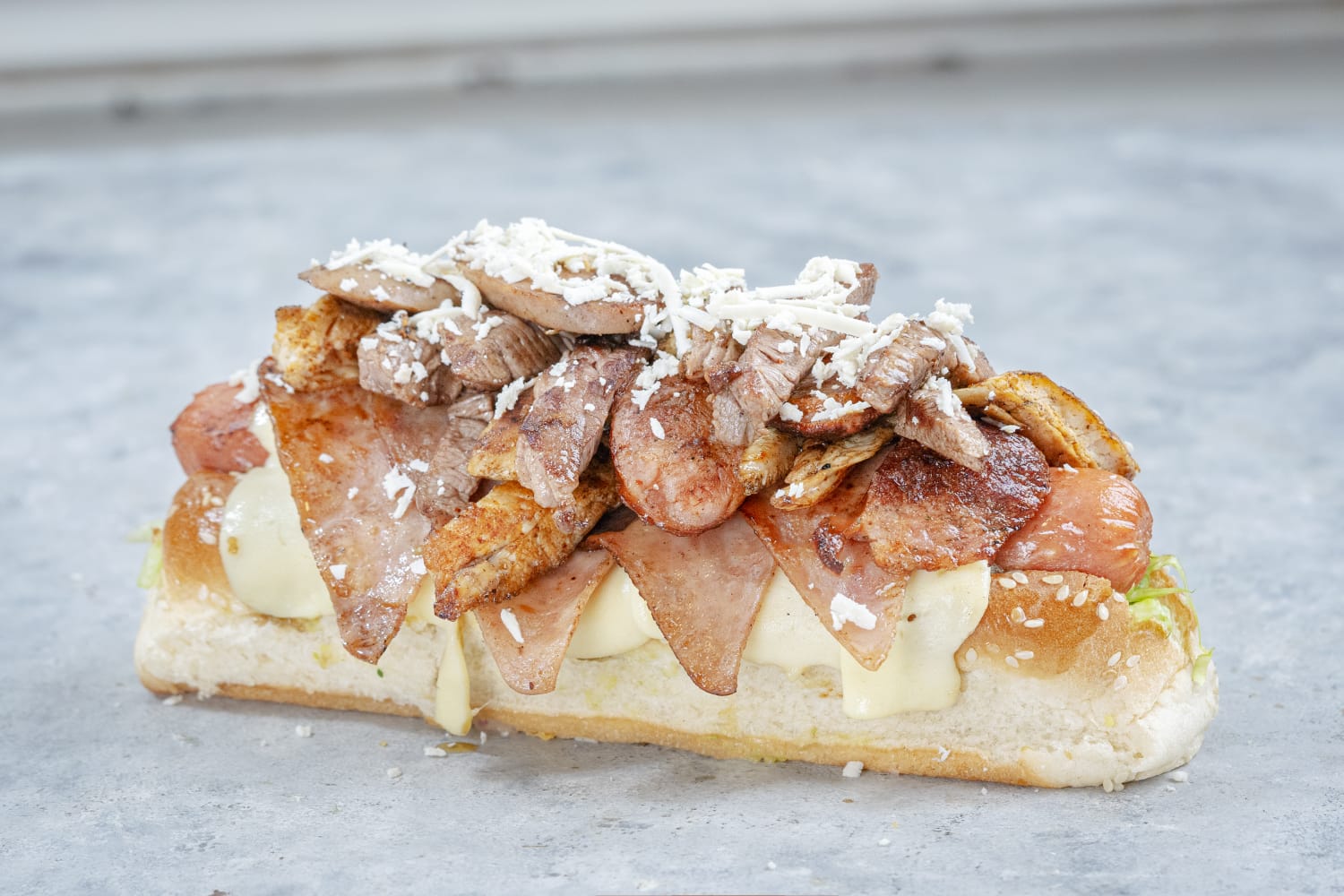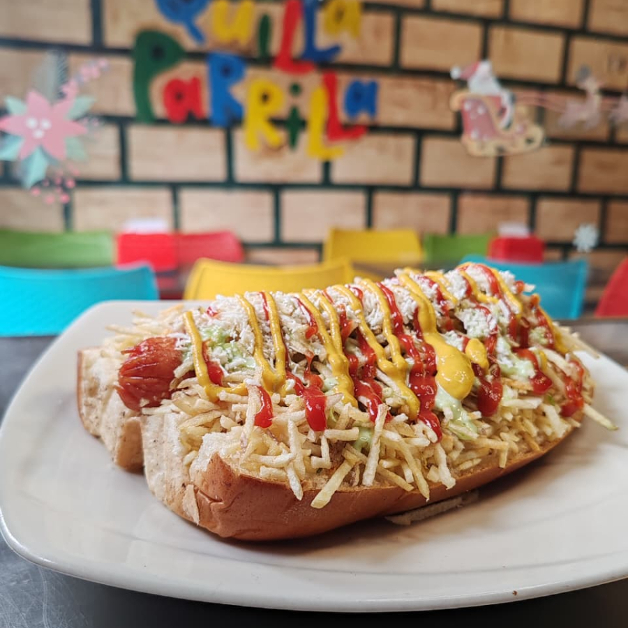 Perro Caliente Quillero Pan Bimbo, salchicha long Zenú, carne, pollo, chorizo, butifarra, queso mozzarella, lechuga.