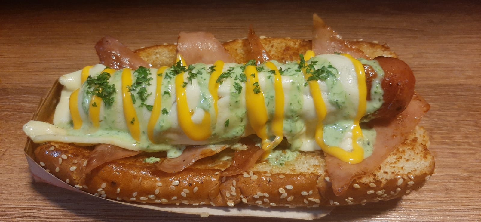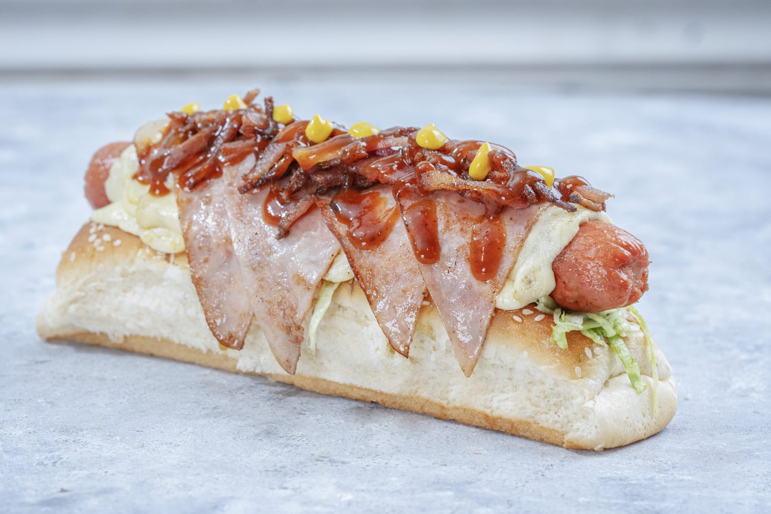 Perro Caliente Italosuizo con Pan Bimbo, salchicha Suiza, tocineta, queso mozzarella y lechuga.