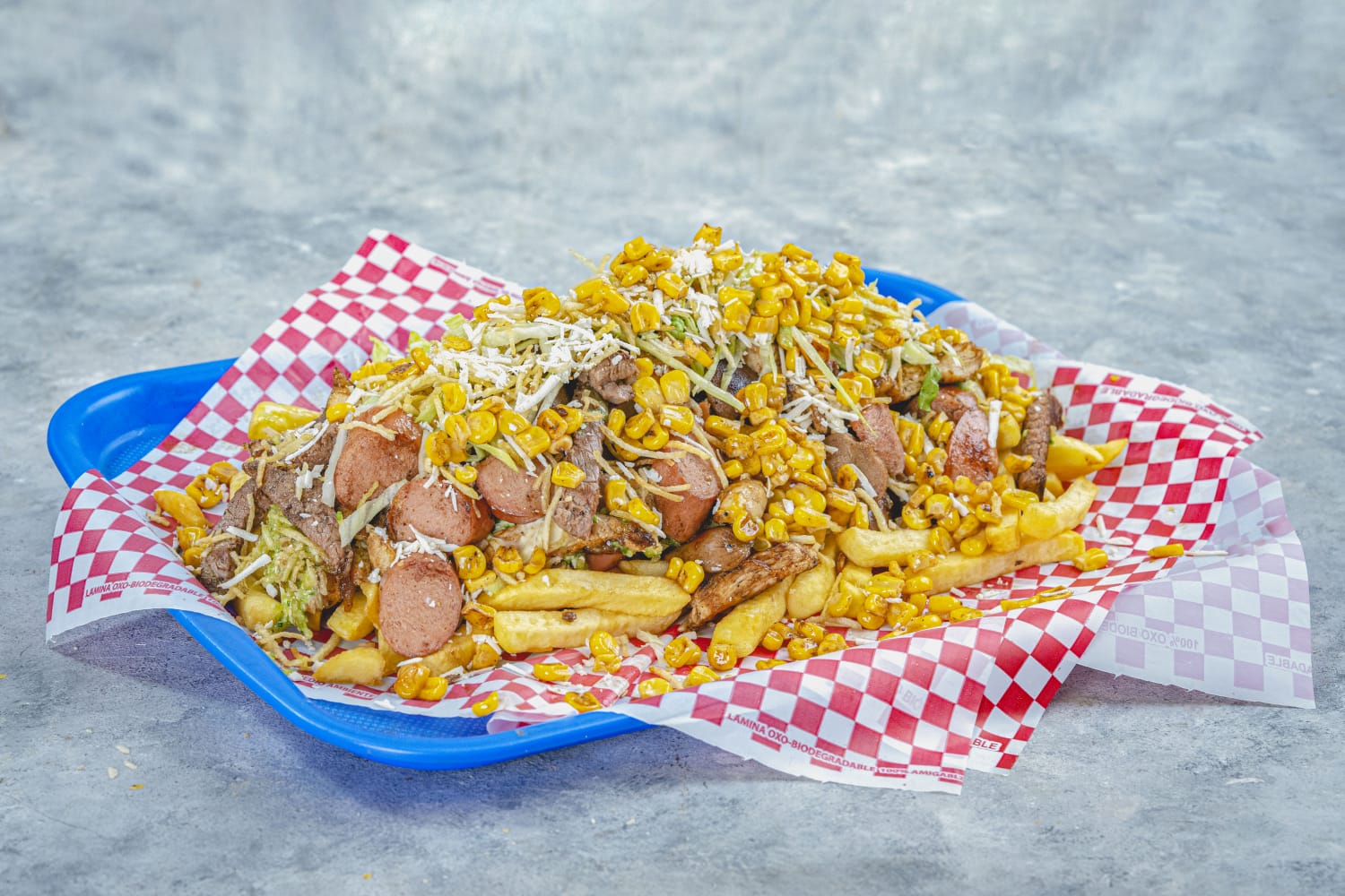 Sugerido para 2 personas. Desgranado Joselito con Papa francesa, maíz tierno, carne, pollo, chorizo, butifarra, queso mozzarella, queso costeño, papa chip, salsas.