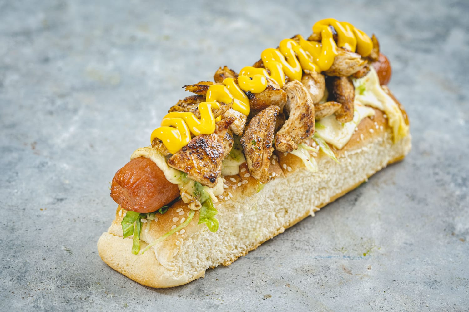 Perro Caliente Polliperro con Pan Bimbo, salchicha long Zenú, trozos de pechuga, queso mozzarella, lechuga .