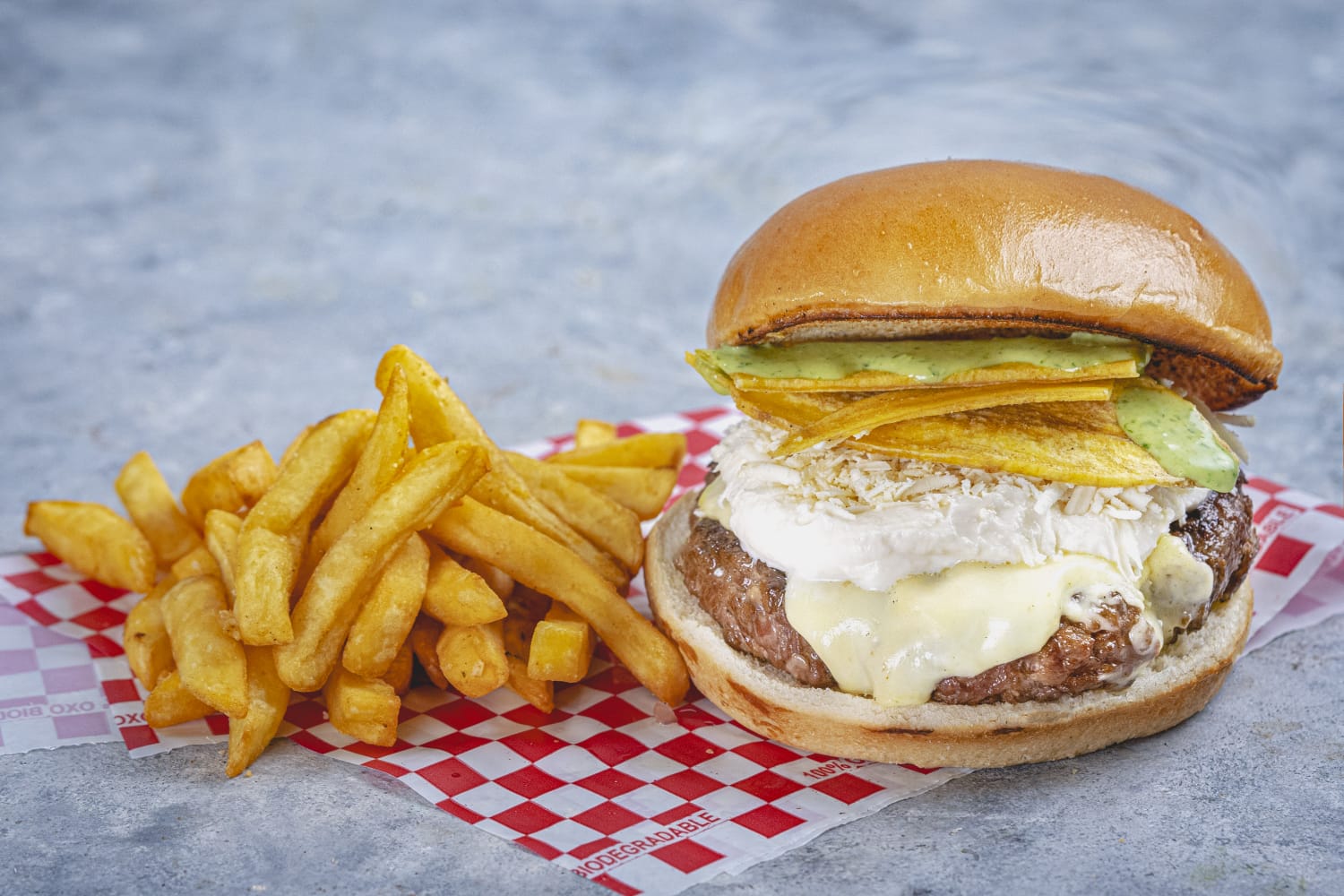 Hamburguesa Costeñita con carne artesanal, suero costeño, queso, platano,papa francesa y gaseosa