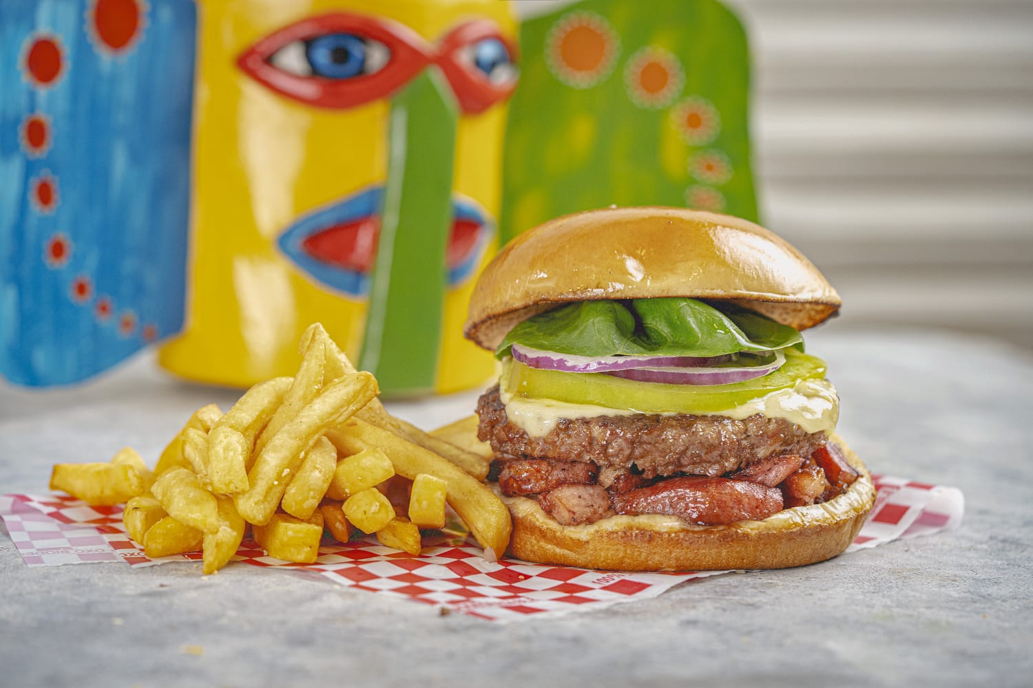 Hamburguesa Ranchera con carne artesanal, costillita de cerdo, queso cheddar, vegetales, salsa de la casa, papa francesa y gaseosa