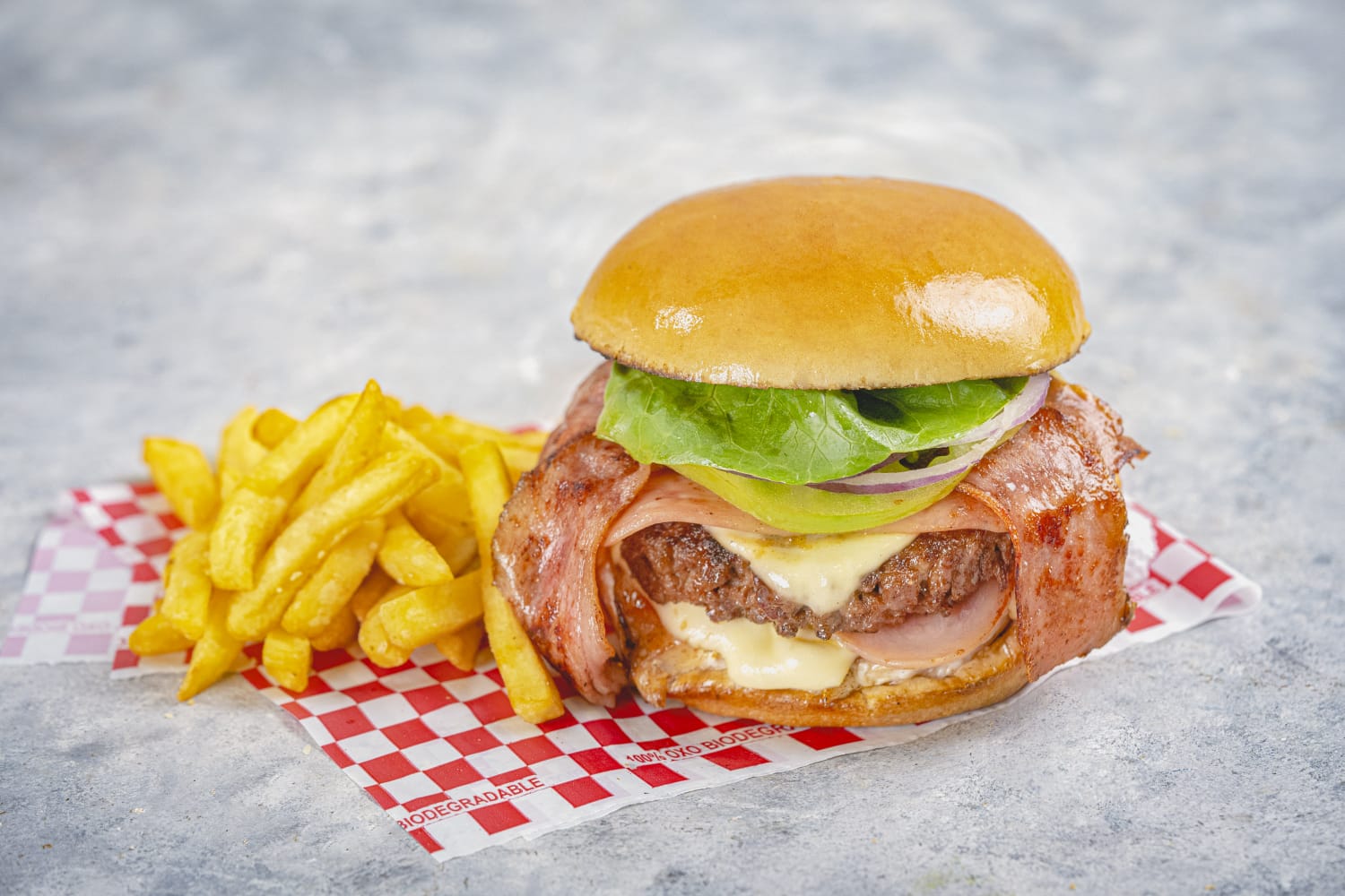 Hamburguesa Garabato con 150gr de carne 100%, queso mozzarella, tomate, cebolla, lechuga,. y salsas.