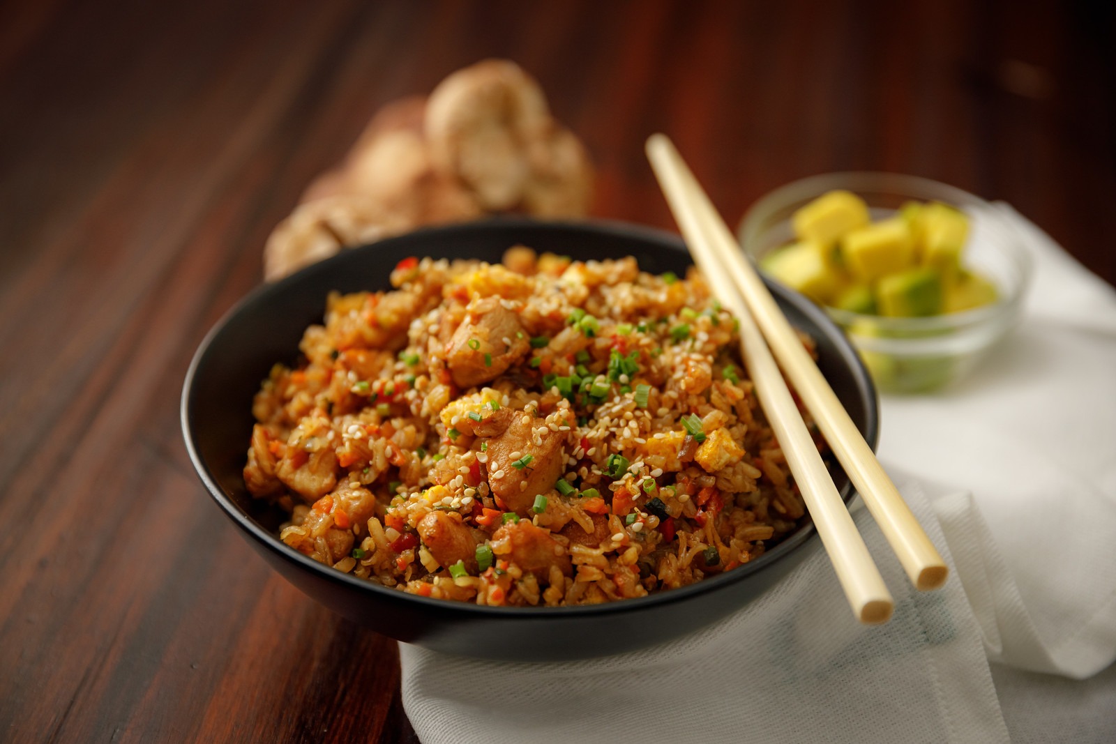 Cubos de pechuga de pollo empanizados y salteados en salsa de naranja agridulce, con especias. Toques dulces, ácidos y picantes, sobre una base de arroz basmati, sésamo y cebolla.