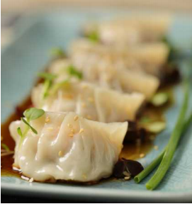 Empanadillas chinas al vapor envueltas en masa de harina de arroz, Aliñadas con ajo, jengibre, ceja, cebollín, soja y mirín.