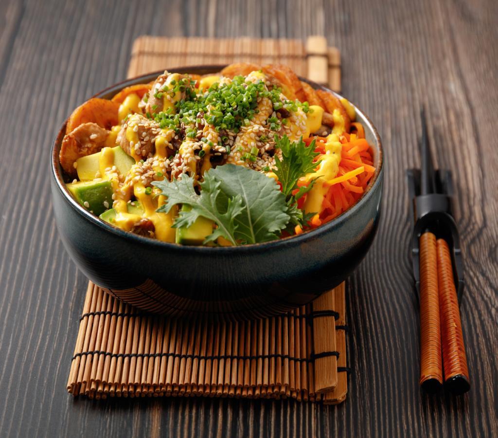 Tuna maguro sellado, salsa yakitori, cebollas tempura, masago, repollo encurtido, edamames, pepino, aguacate, mango, lechuga, masago y ajonjolí sobre una base de arroz de sushi.