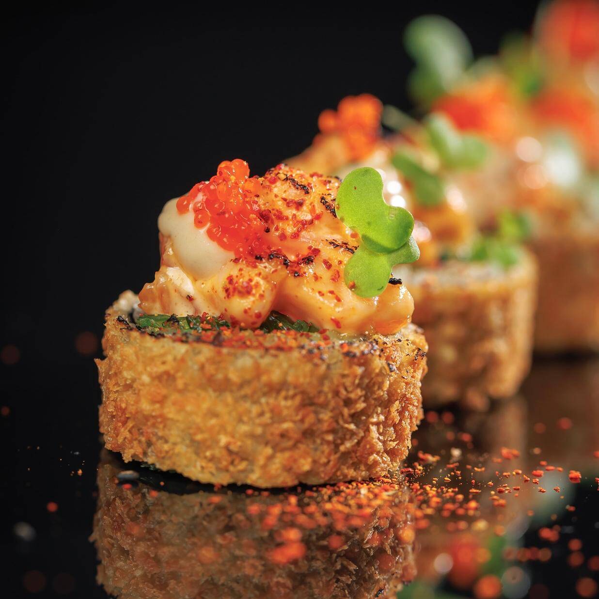(8pzs) Roll apanado en panko, relleno de seaweed salad, aguacate y kanikama, topping de tartar de salmón gratinado con mayonesa de mostaza dijon y miel, con tosago y togarashi.