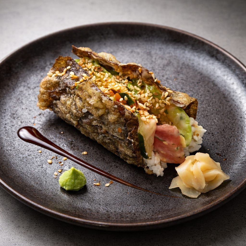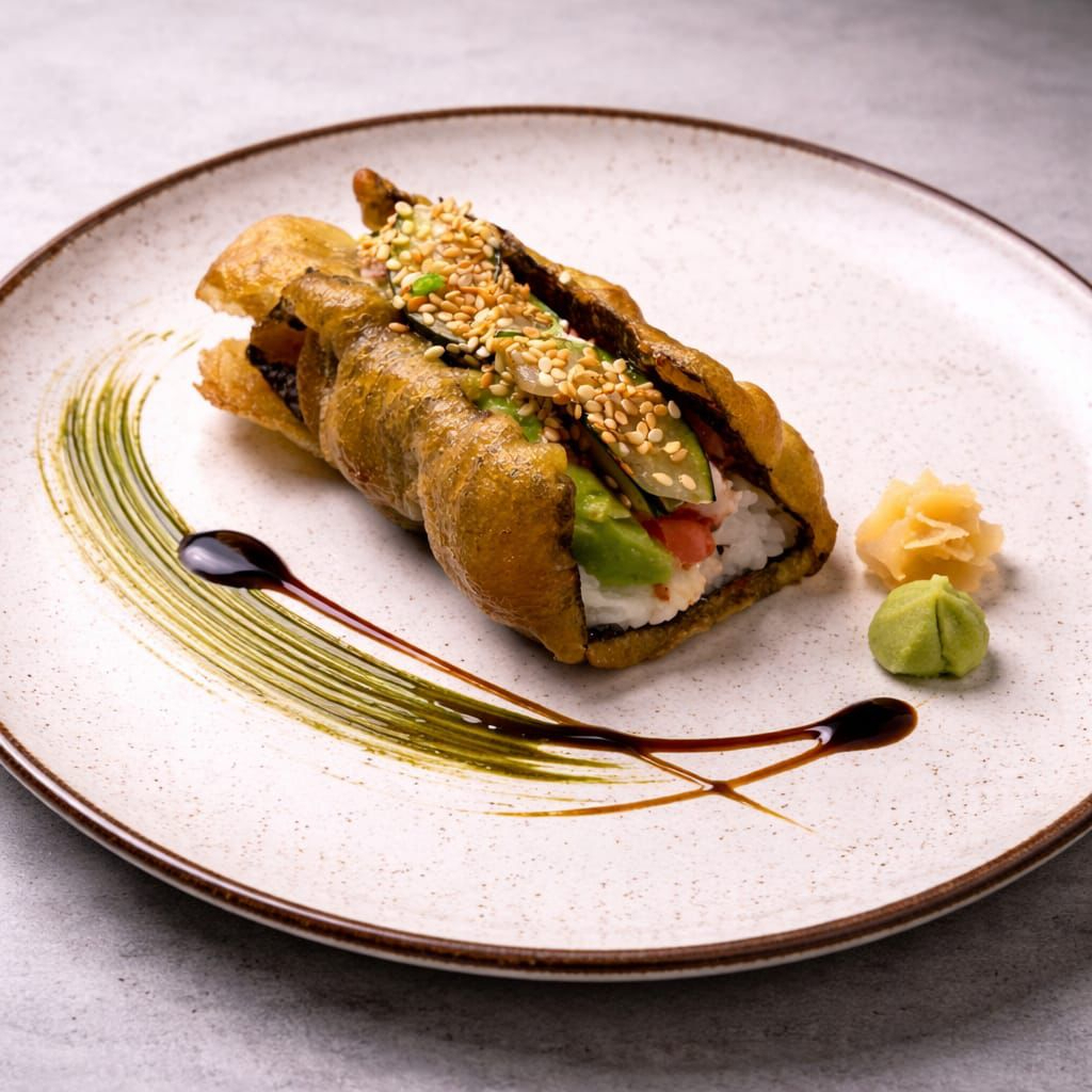 Maki relleno de pescado tempura, aguacate, queso crema, mayonesa japonesa, bañado con un topping de skin de salmón.