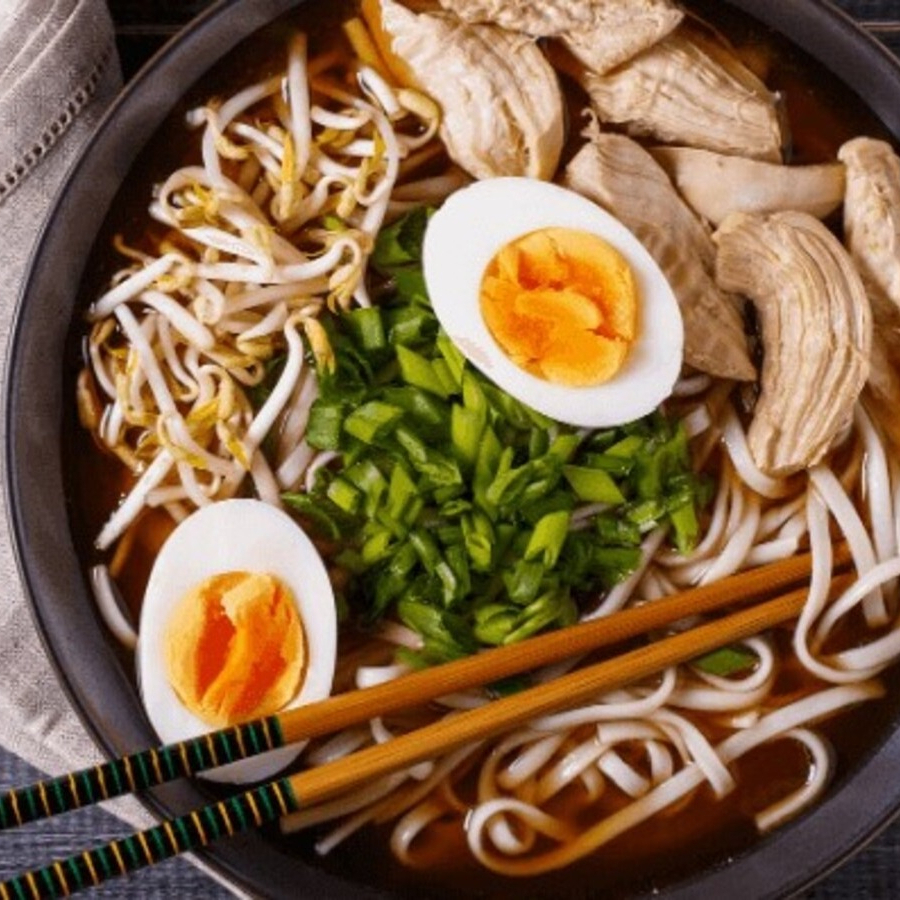 Ramen con fideos artesanales sumergidos en un caldo hecho a fuego lento, acompañado de trozos de pollo salteados al wok, huevo de yema suave, brotes de bambú y cebollín fresco.