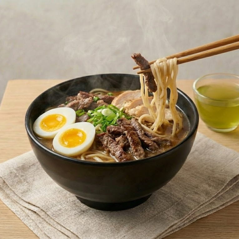 Un litro de ramen de pollo y res con fideos artesanales en caldo hecho a fuego lento, acompañado de carne salteada al wok, huevo de yema suave y cebollín fresco. (Porción personal)