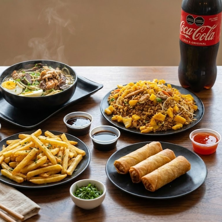 1 Ramen con fideos artesanales sumergidos en un caldo hecho a fuego lento, acompañado de trozos de pollo salteados al wok, huevo de yema suave, brotes de bambú y cebollín fresco + 1250gr. Arroz Salteado Al Wok ,Acompañado con trozitos de Pollo,Carne,Jamon, vegetales, Habuchuela,Raiz China Y Zanahoria + Papas Francesas + 2 Lumpias + Salsas + Coca-Cola1.5